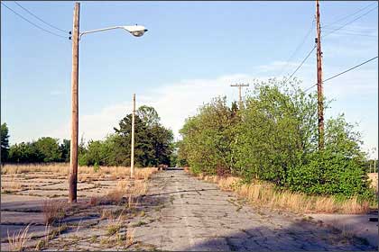 Early in 2000 we discovered one crumpled Quonset hut hidden among young pines along Battalion Blvd, its building number AH-3B still legible . Only one end of this Quonset still stands, the remainder of it peeled away and flattened down to the concrete foundation. Within a half-mile of this former latrine stands an 18th century farmhouse that somehow survived the vast changes Davisville experienced in the 1940s. The historic Allen-Madison House (D272) was used by the Navy for officer's housing during the base's active days, but like the other Davisville buildings, it too was secured and forgotten. Recently, efforts have begun to restore this farmhouse. After a year and a half of photographing and exploring the newly forested camp and finding little more than the vacant lot that presents itself there, we heard that two underground missile silos in the vicinity had been abandoned only a few years earlier. Local rumors that an atomic bomb had been stored on the Quonset / Davisville site are, however, said to be unfounded. The only large structure in Camp Thomas is Building 224, which remains with its cluster of ancillary buildings strung out around it. Bldg. 224 provided recreation, dining, and health services to the Seabees stationed here. Later as needs changed, the building provided facilities for the supply, maintenance and overhaul of construction equipment. An indoor pool was filled with concrete, and its edges and gutters remain as an outline on the vast warehouse floor. Today this bowstring truss warehouse is the off-season home for equipment relating to the Gravity Games. Upstairs in a room of the abandoned administrative offices there is a sign warning against the photocopying of classified documents. The hall outside this office is strewn with records of inventory, shipping, and receiving, apparently flung from the file cabinet drawers. ![]() |