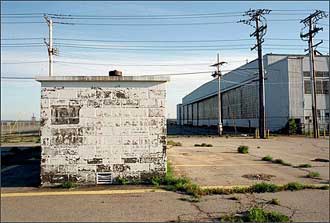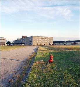 The massive changes exerted upon the Quonset landscape, coupled with the stark aesthetic of Kahn's modern designs, led some at the newly activated base to call for decoration. Captain Andrew McFall, Quonset Point's first Commanding Officer, wrote to the Bureau of Aeronautics requesting $50,000 for "grass and some shrubbery" to improve the base. His claim that "the rather sparse appearance of the architecture of the personnel buildings" needed ornamentation was accepted by the bureau, which allocated $35,000 for landscaping. Though they've grown far beyond their intended size and borders, Quonset's plantings retain their separate identity as "landscaping" distinct from a surrounding landscape that has largely gone wild. General DynamicsThe most prominent feature of Quonset's landscape is an enormous hangar-type structure that dwarfs neighboring Buildings 1, 2 and 406. In the years following the decline of the Naval Air Station, the manufacture of nuclear submarines at General Dynamics' Quonset Point site has come to define the majority of activity on the base as a whole. And though GD relinquished use of Buildings 1 and 2 in the early 1990's, it still lays claim to Bldg. 406 and many other structures located around Airport Road and Roger Williams Way. In most areas of Quonset and Davisville, the occasional "No Photography" sign can safely be regarded as a relic of an earlier era, but the rule is still strictly enforced in the vicinity of any buildings under General Dynamics' control. On many occasions we were met by polite but stern security guards who were concerned that our cameras might be aimed at the wrong thing. Water towers Modern water towers now stand in place of the checkered, barrel-style towers that once distinguished Quonset from the air, the Bay, and nearby roads. Five of the original towers, which appear as landmarks on roadmaps and nautical charts, were demolished in the spring of 1999. Though decrepit in their outward appearance, these structures still proved to be remarkably sound: we watched all morning while demolition contractors attempted to accomplish the job they had told us would take only half an hour. Four tries, three hours, and a truckload of ballast later, the backhoe prevailed and the tower gave way. Warehouses Standing in the center of the large open grass field between 4th and 5th Avenues, one is surrounded on three sides by buildings of monumental scale: the landplane hangars to the east, the Kahn-designed barracks to the west, and the rhythmic row of warehouse types to the south. These warehouses are set at regular angles along the 4th Ave. railroad spur, stretching into the distance. Pairs of bowstring truss buildings stand side by side with several monitor gable warehouses. Their rhythmic order is abruptly punctuated by the austerity of Building 16, the Supply Department. The design of this reinforced concrete building was based around one of the latest storehouse technologies the forklift and the new 4' x 4' pallet system. Celestial navigationQuonset's array of structural mammoths and oddities is compelling in part because of the gesture each makes toward use, a gesture whose meaning becomes estranged as these once-useful buildings slide into decay. One Quonset veteran explained to us that the three vertical sections of Building 457 were used for parachute repair. Another contended that each of the domes contained a replica of the night sky where pilots were trained in night flying. Each explanation suggests an imaginative, form-follows-function approach to interpreting a structure whose use is not immediately evident. We used this same approach in developing quick-reference names for buildings our maps distinguished only by number. We called this complex "The Silos," a name that reflects the agricultural look of the three towers, and the overall Cold War cast of the site. Of the three possible explanations for building 457's "silos," the weirdest turns out to be right: the complex was used for celestial navigation. * Architecture in the National Defense Building Program, Michigan Society of Architects Weekly Bulletin, No. 52, December 30, 1941, p. 52. ![]() |